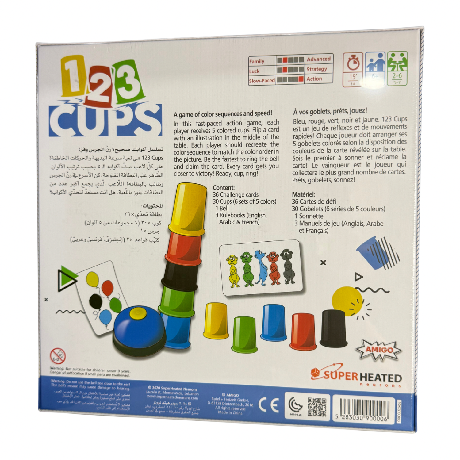 123 Cups is a fast-paced, colorful stacking game that challenges your speed and attention. Each player gets five colored cups. A challenge card is flipped to reveal a color pattern or sequence.