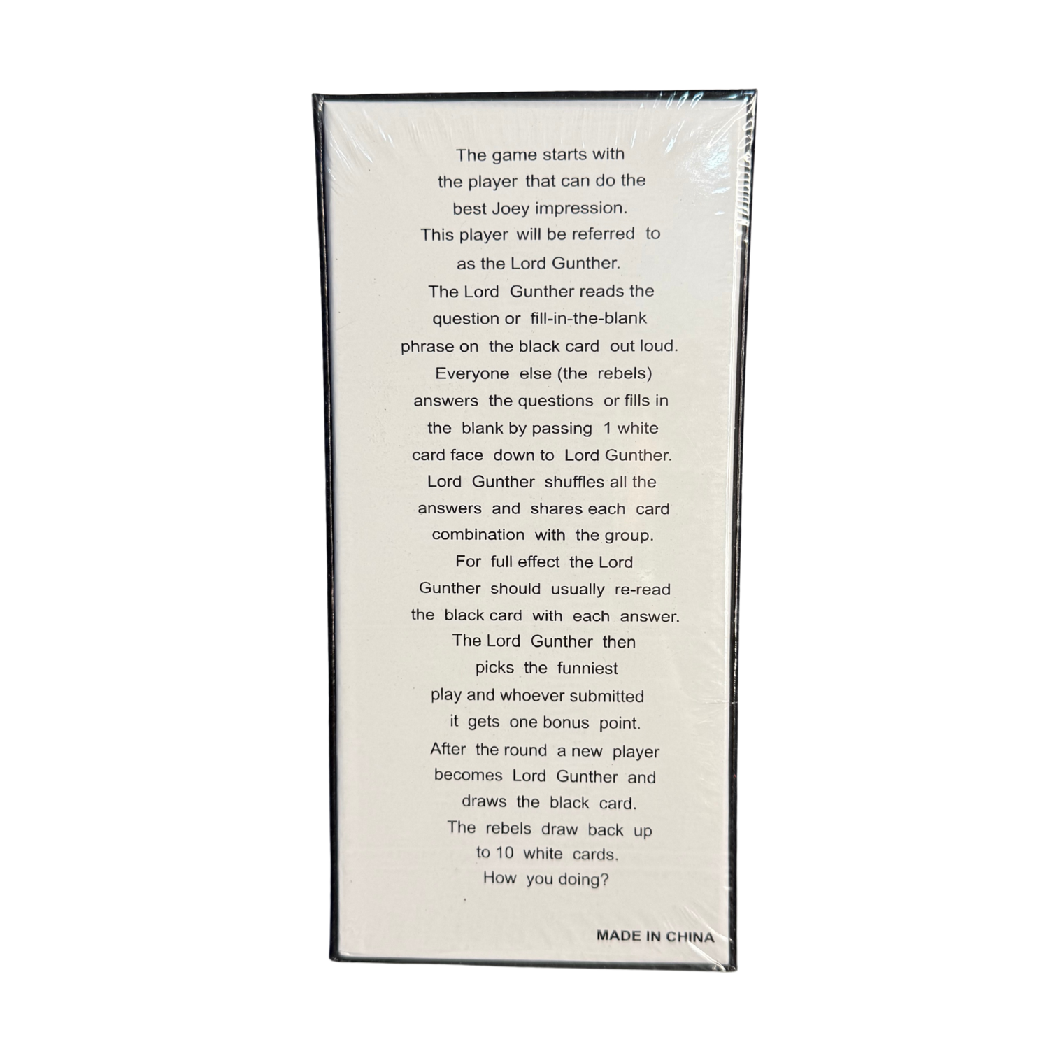 The game starts with the player who can do the best Joey impression they become Lord Gunther. Lord Gunther reads a black card (a question or fill-in-the-blank phrase) aloud. Other players, known as rebels, choose one white card from their hand to answer or complete the phrase and submit it face down.