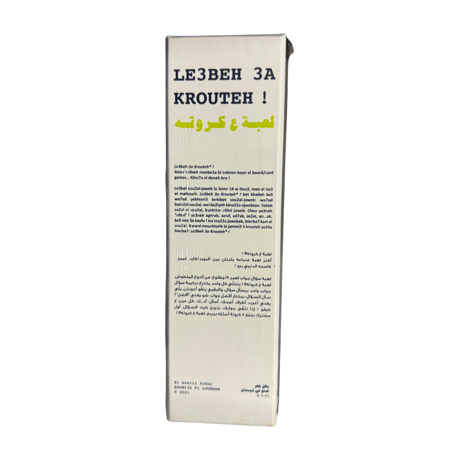 Le3beh 3a Krouteh! is a Lebanese party card game full of humor and cultural references. Players take turns drawing cards that contain questions, challenges, or hilarious situations in Lebanese Arabic. Everyone answers or performs their tasks often leading to laughter, roasting, and inside jokes.