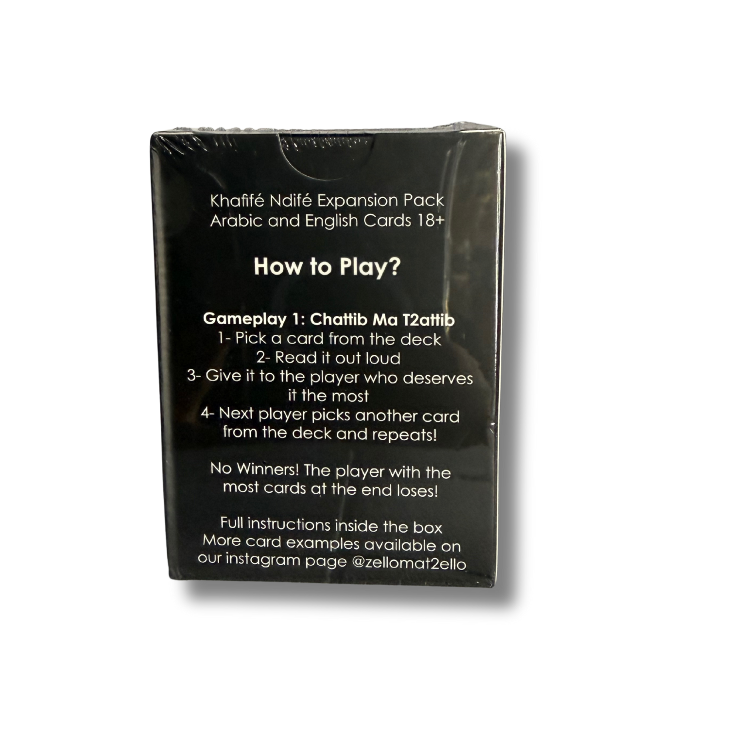 This is an expansion pack for the popular Lebanese party game Zello Ma Tzello, featuring new Arabic and English cards for adults (18+).